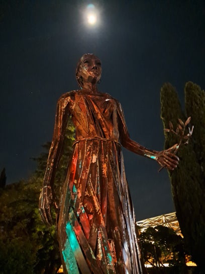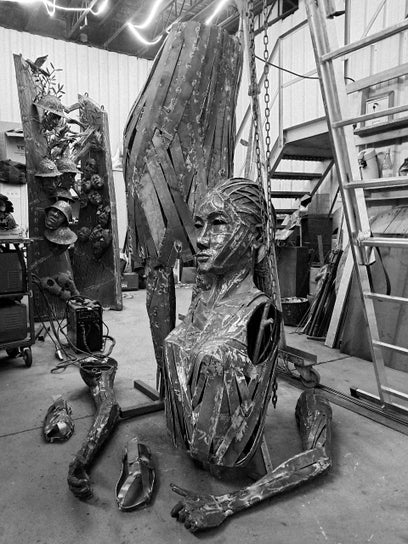 Son corps d’acier ajouré capte la lumière comme l’eau capte le ciel. Les vides et les reflets créent un jeu fluide où circule le souffle : Manon devient la source elle-même, à la fois force vitale et conscience du monde. L’eau ne jaillit plus à ses pieds, elle vit en elle, claire, libre, indomptable.